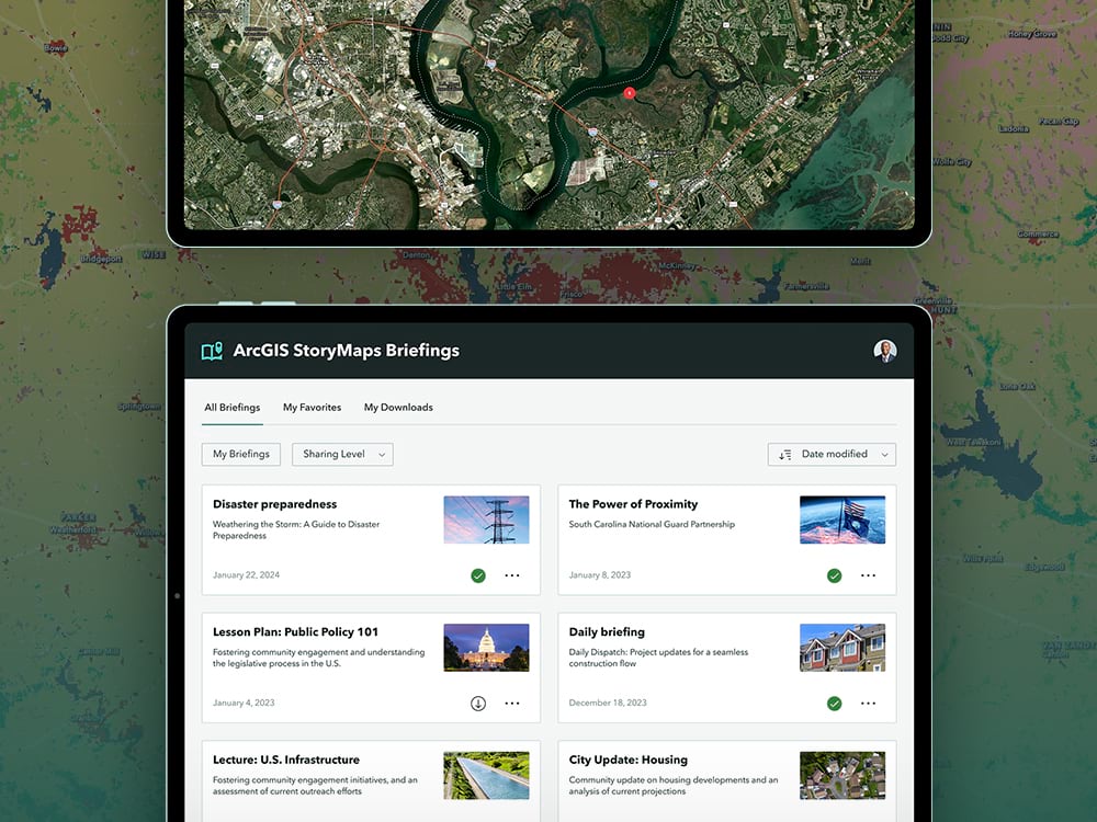 • Простой доступ — где угодно и когда угодно: Делитесь своими брифингами внутри организации или вне её с помощью ссылок, либо открывайте их в приложении ArcGIS StoryMaps Briefings, чтобы просматривать и делиться ими на ходу или даже запускать их в офлайн режиме.