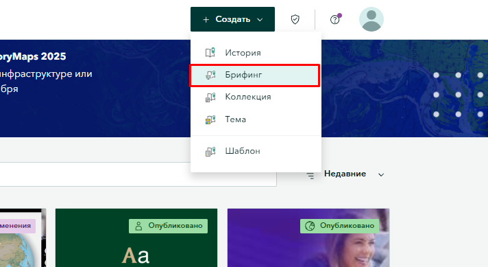 Начать работу с брифингами так же просто, как создать историю в ArcGIS StoryMaps. Вы можете получить доступ к брифингам через свою учётную запись, если вы являетесь участником организации ArcGIS. Просто войдите в систему и перейдите в приложение ArcGIS StoryMaps через панель запуска приложений. Внутри ArcGIS StoryMaps кликните Создать — Брифинг в меню справа и начните создавать увлекательные презентации.